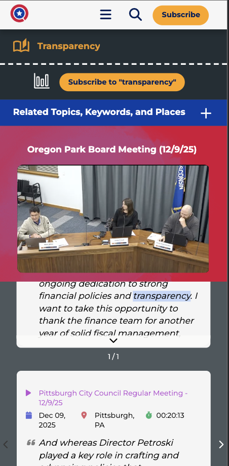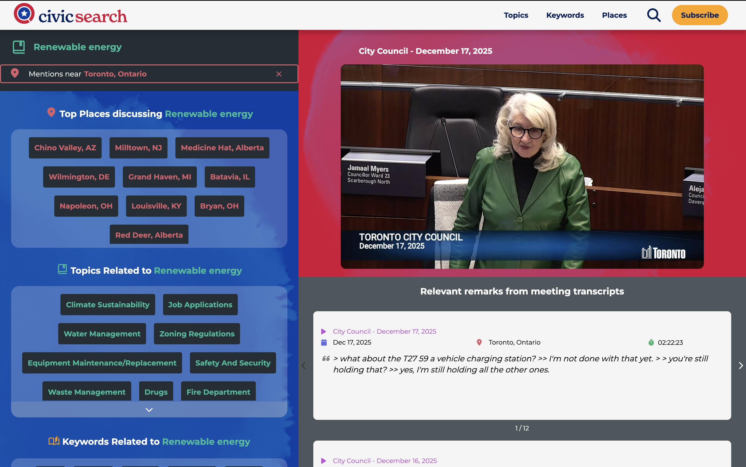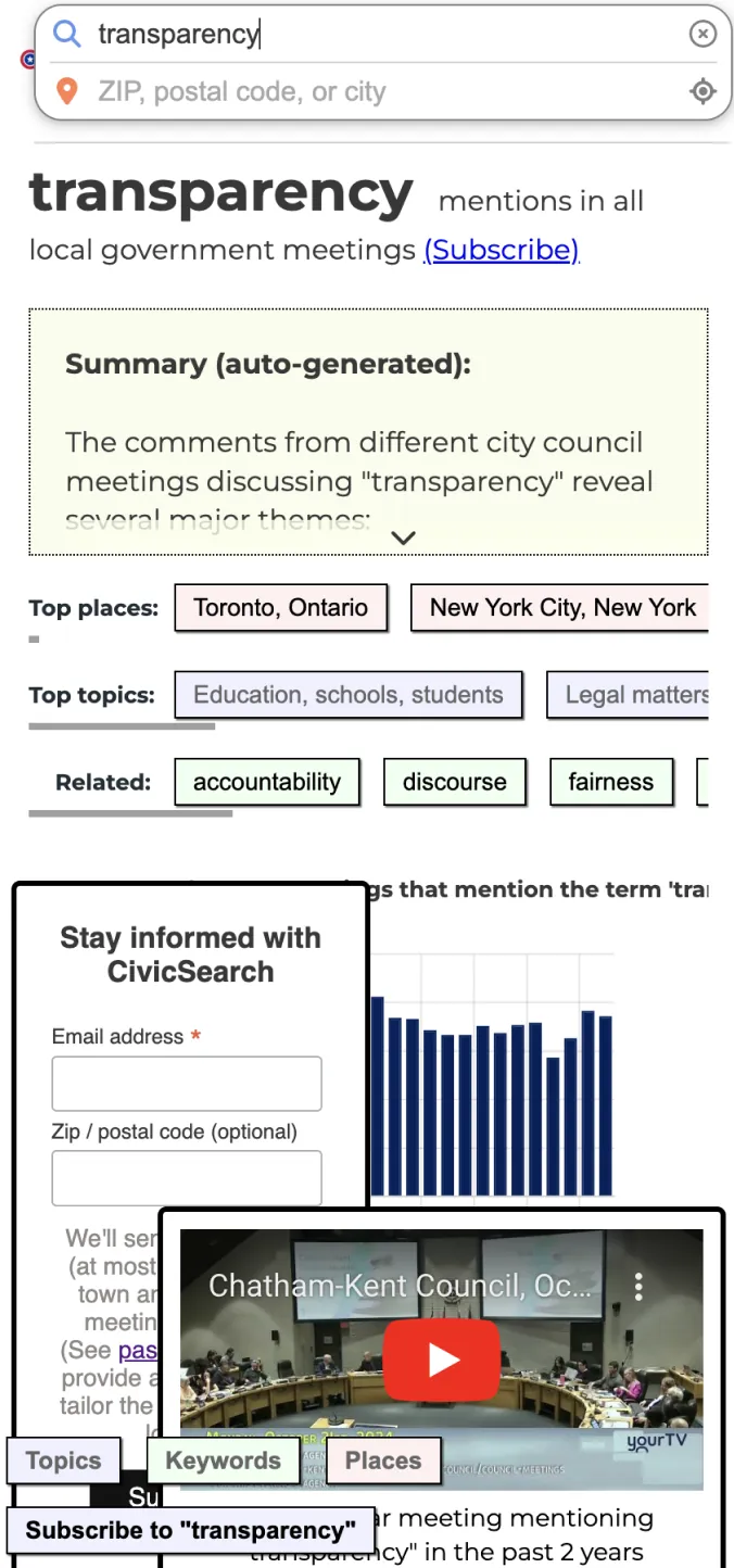 CivicSearch is a civic technology platform that aggregates and indexes city council meeting transcripts across the US and Canada. As local journalism continues to decline, this platform serves as a critical tool for citizens, researchers, policymakers, and journalists to access information about local government decisions affecting their communities.