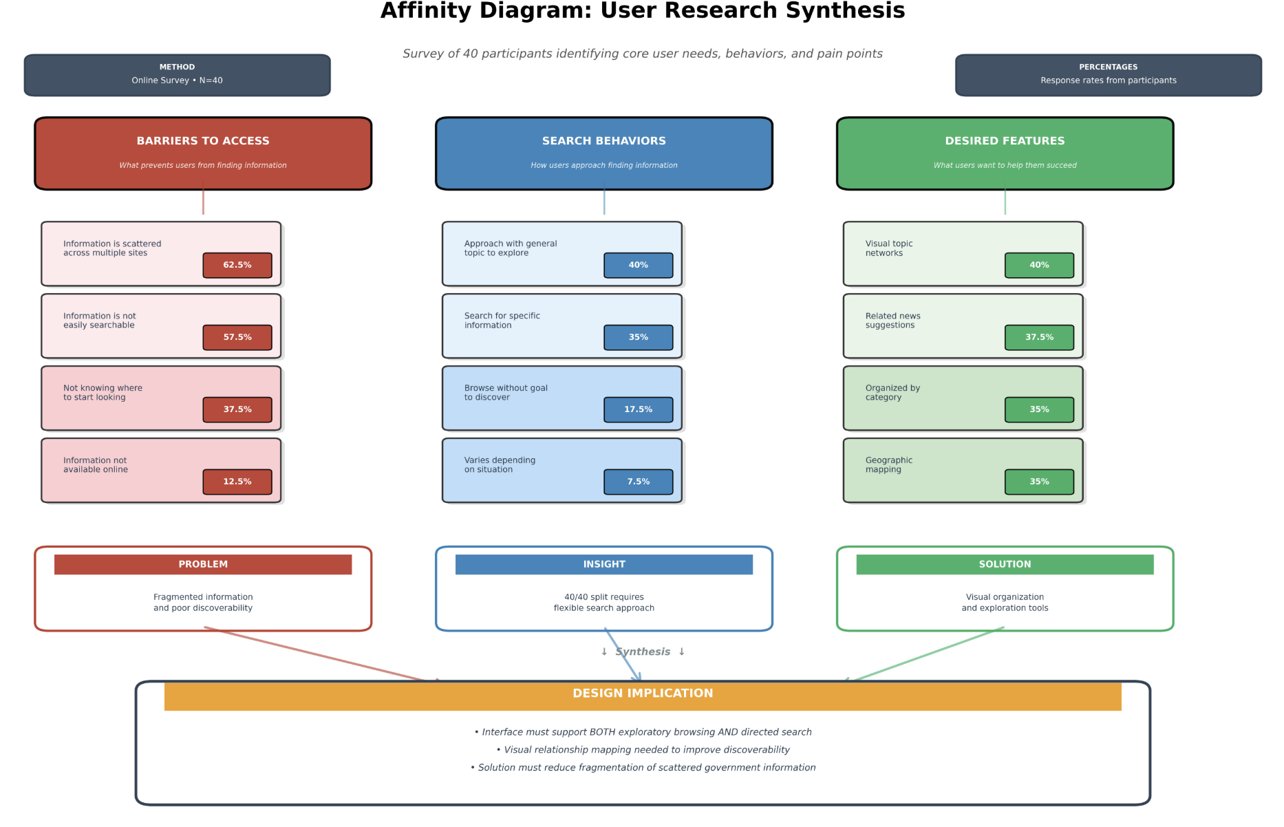 The core problem identified through research: users needed to bridge exploratory and directed search paradigms. Citizens often don't know what they're looking for until they see it (exploratory search), while researchers need precise filtering capabilities (directed search). The solution needed to serve both use cases effectively without overwhelming either group.