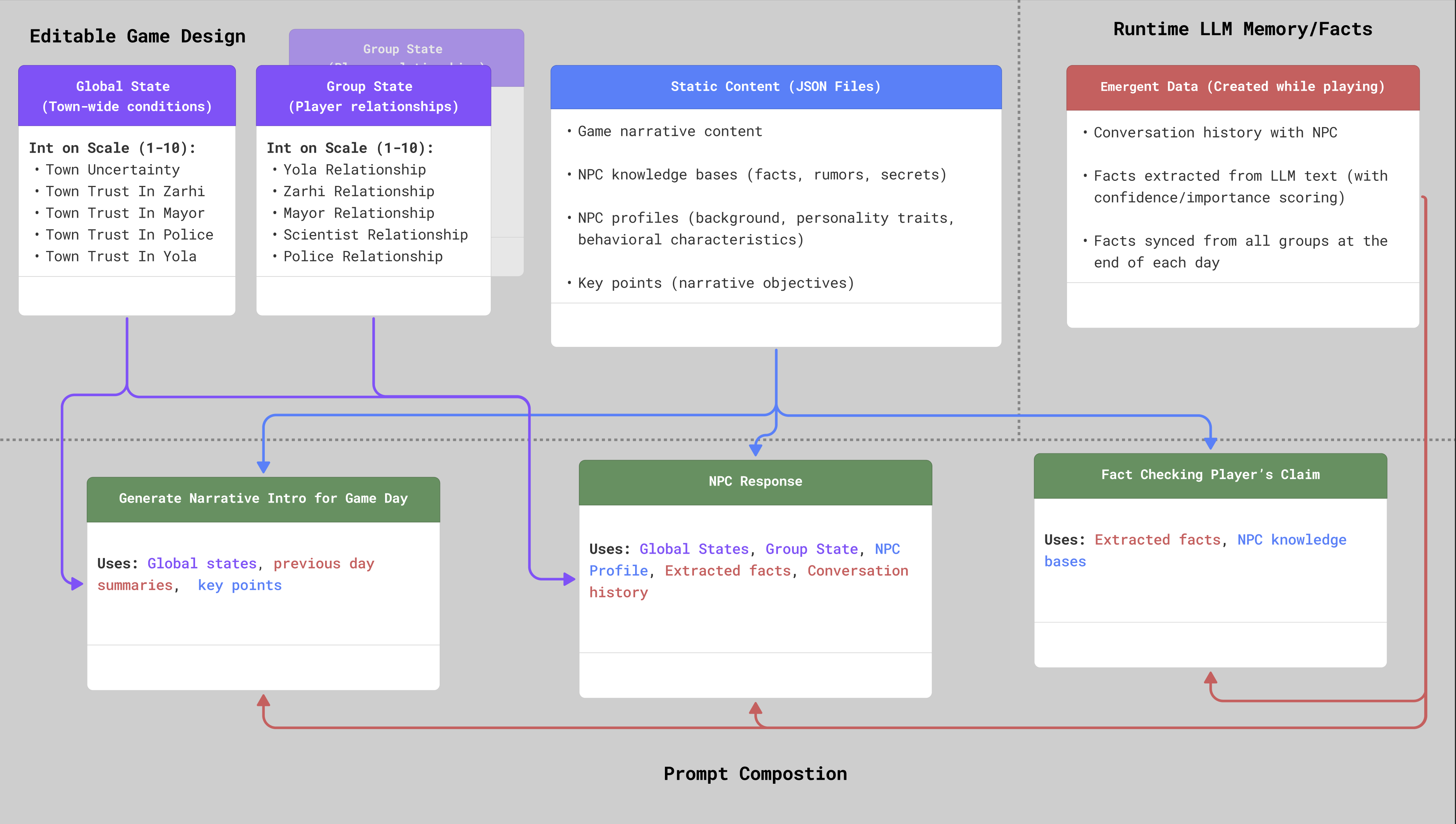 The educational game Zarhi's Missing faced a critical challenge: creating dynamic, scalable NPC interactions for 30+ simultaneous student players while maintaining pedagogical alignment with media literacy goals. Traditional static narratives couldn't adapt to diverse student questioning or provide the emergent storytelling needed for authentic learning about journalism, bias, and fact-checking.